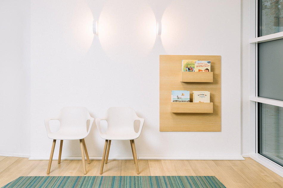 Im Neubau eines Wohn- und Geschäftshauses in Gütersloh wurde im Erdgeschoss eine Praxis für Kinder- und Jugendmedizin ausgebaut. Die Lage direkt an der Straßenkreuzung und der Zuschnitt der Grundflächen waren für die Umsetzung des Raumkonzeptes eine besondere Herausforderung. Große Glasflächen öffnen die Praxis zur Straße und bieten Einblick. Im Inneren sorgen Glaswände für die Belichtung des Empfangs und der inneren Flurbereiche. Wir haben bei der Planung und Umsetzung die Anzahl der Behandlungsräume mit den Nutzern abgestimmt sowie Funktionalität und interne Abläufe berücksichtigt. Durch den Einsatz von Naturholz in Kombination mit der Auswahl der Logo-Farben bei der Gestaltung sowie des Materials und der anspruchsvollen Beleuchtung entstand ein heller, freundlicher Gesamteindruck. Ein barrierefreies WC, Wickelplatz, getrennte Wartebereiche für Kleinkinder und Jugendliche sowie viel Raum zum Spielen runden das Gesamtkonzept ab.