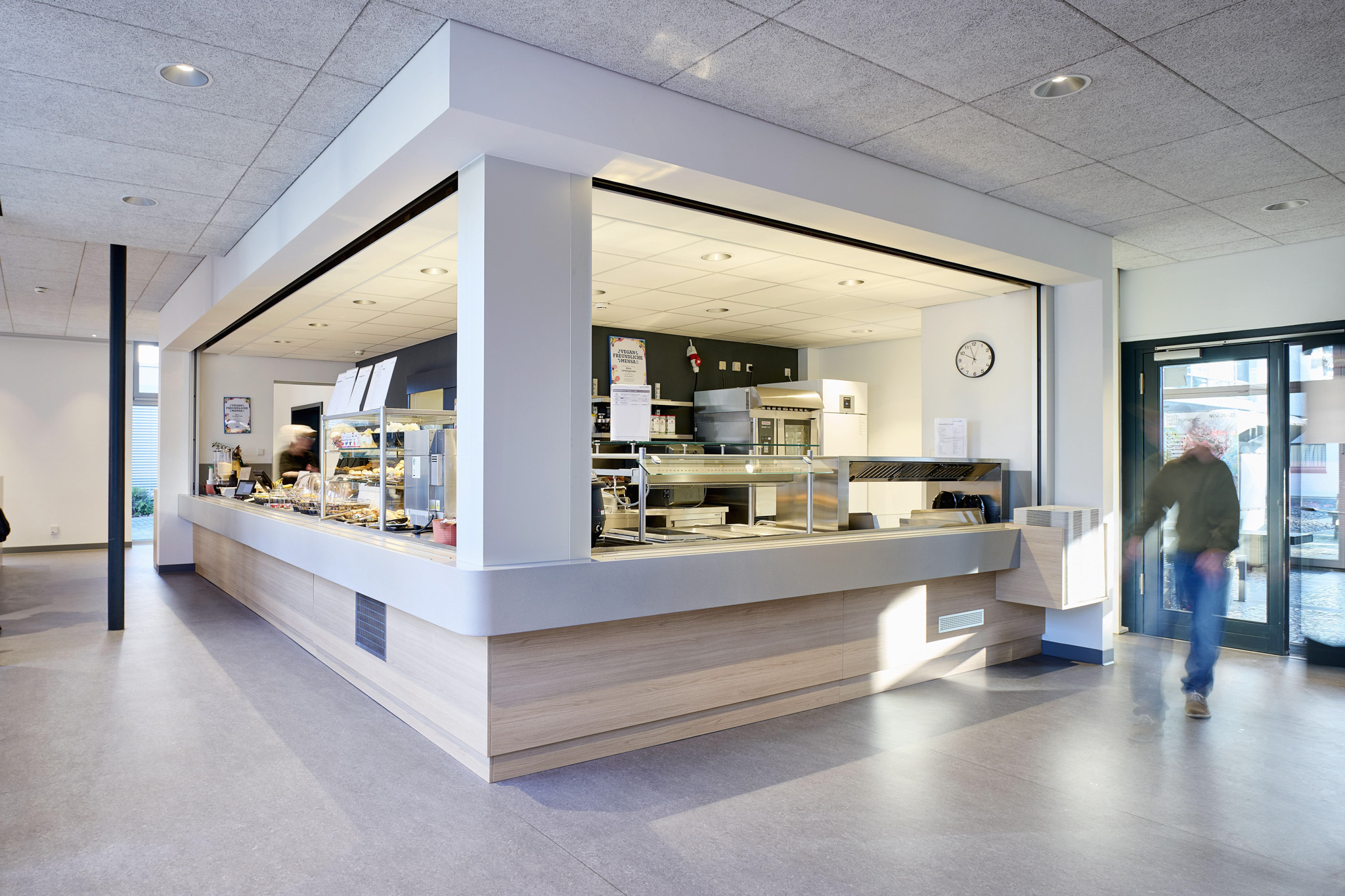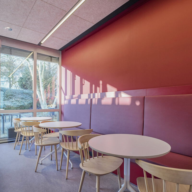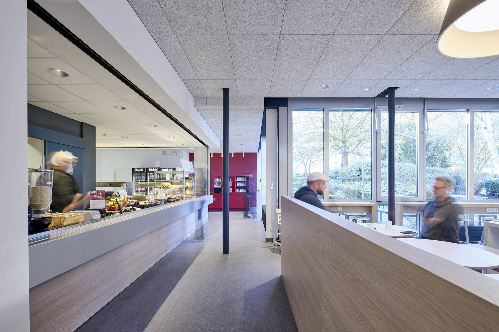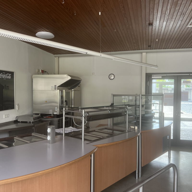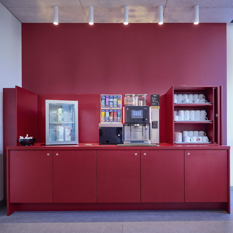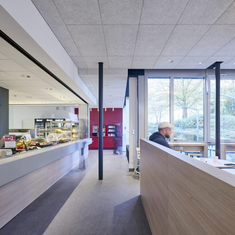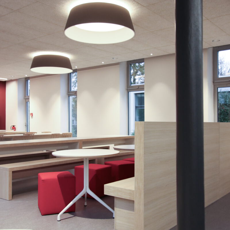 Die Sanierung der Mensa in der Hochschule sollte die Möglichkeit der durchgehenden Nutzung ermöglichen, also auch außerhalb der Öffnungszeiten als Aufenthaltsraum dienen. Die Raumgröße der ehemaligen Mensa wurde nicht verändert. Die vorhanden Tresenelemente wurden tischlermäßig umbaut, mit neuen Ausgabeplatten versehen und können nun durch motorische Rolladenanlagen verschlossen werden. Die Versorgung mit Getränken und Kaffee erfolgt unabhängig von den Öffnungszeiten über Automaten, welche in einer Wandnische, in der Nähe der Ausgabe platziert wurde. Zur Verbesserung der Raumakustik wurde eine HERADESIGN Decke eingebaut, im Bereich der Küche und im Nebenbereich Mineralfaserdecken. Unterschiedliche Sitzgruppen, an Einzeltischen, Bänken und Hockern sorgen für eine aufgelockerte Atmosphäre. Besonders die drei großen Leuchtschirme sorgen in Kombination mit den Einbauleuchten für ein harmonisches Gesamtbild. Durch den Einsatz von hellem Naturholz, weißen Flächen und den roten Sitzpoolstern und Einbauten wurde eine ruhige und freundliche Aufenthaltsqualität geschaffen.