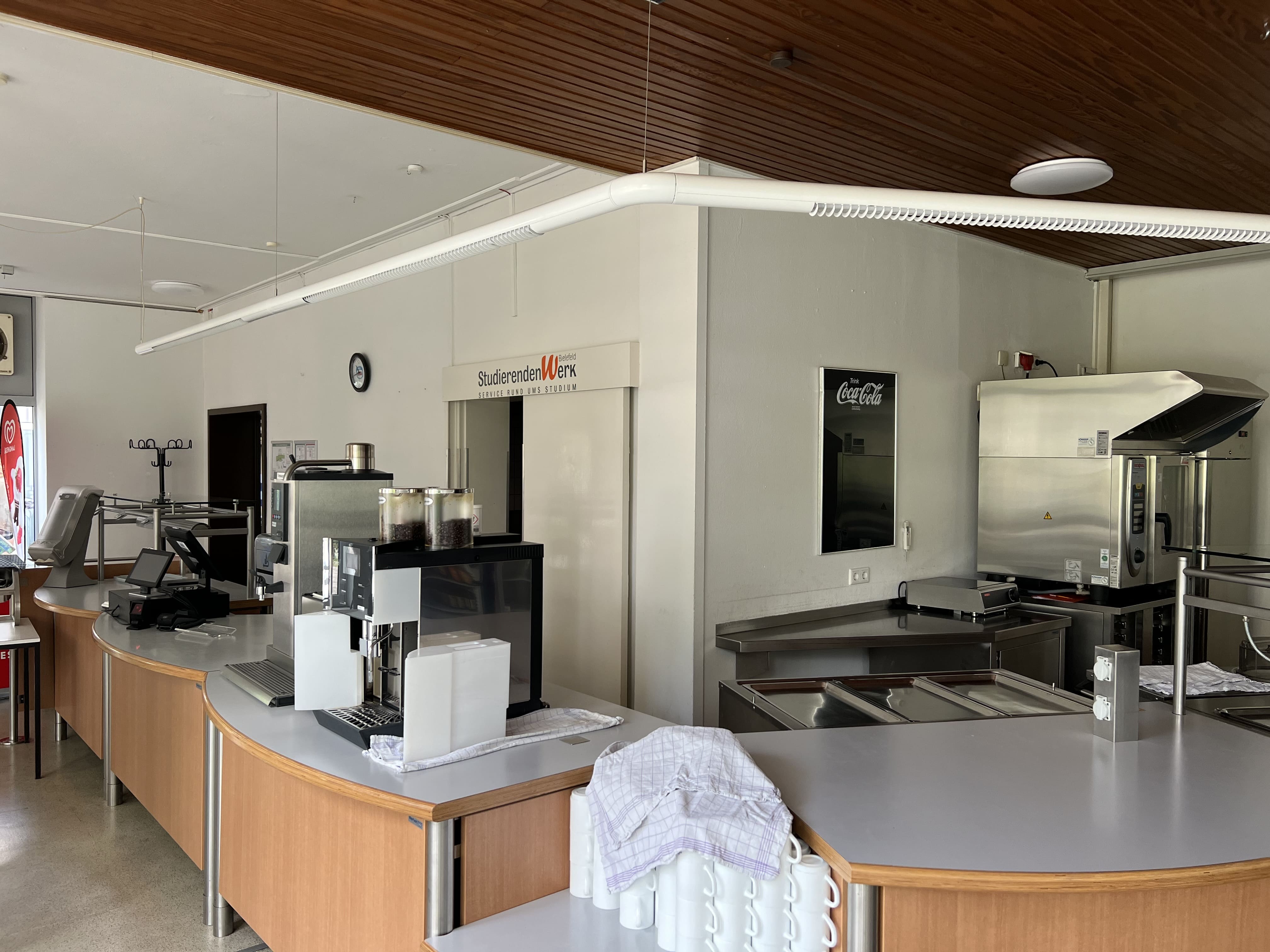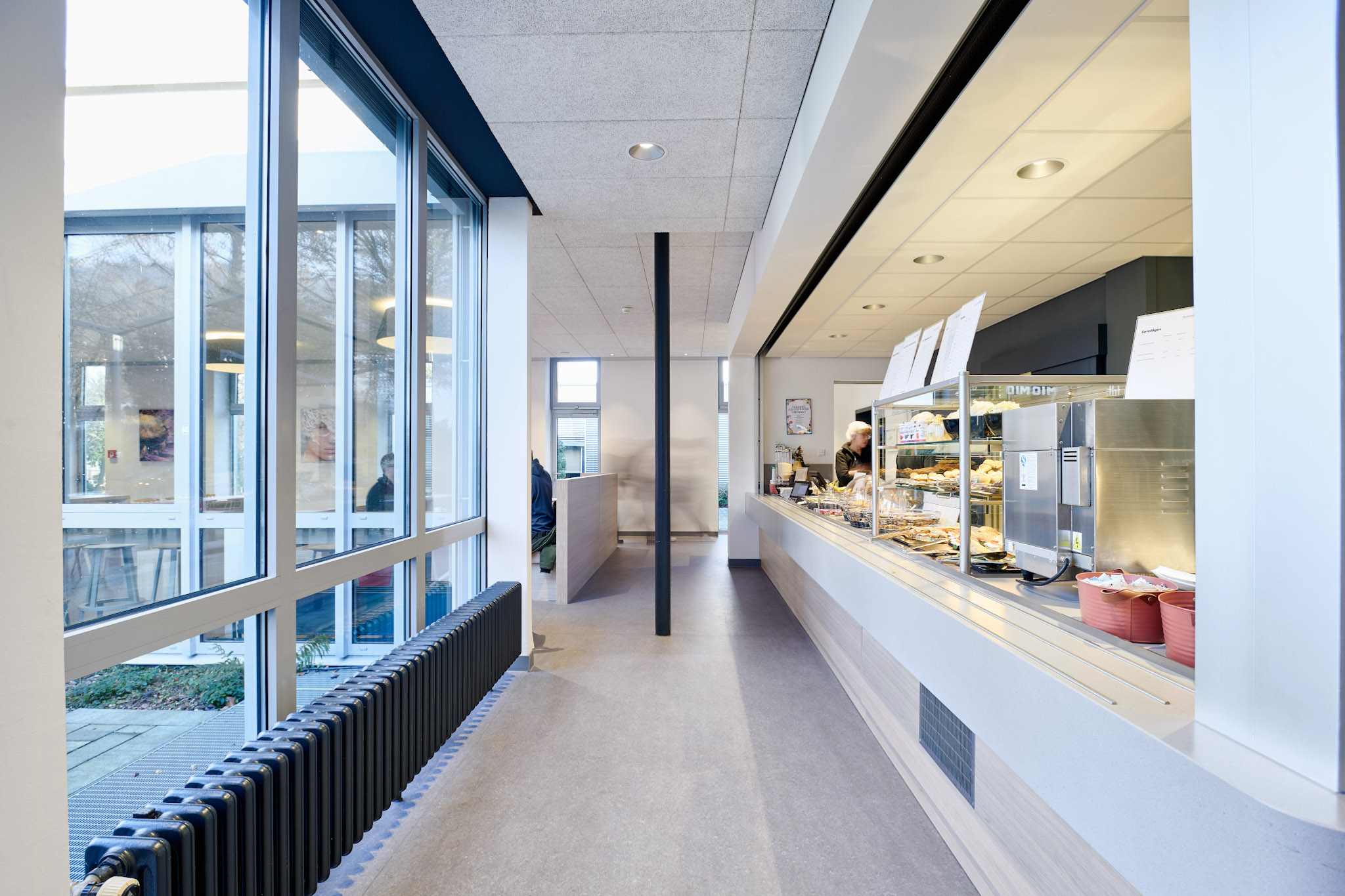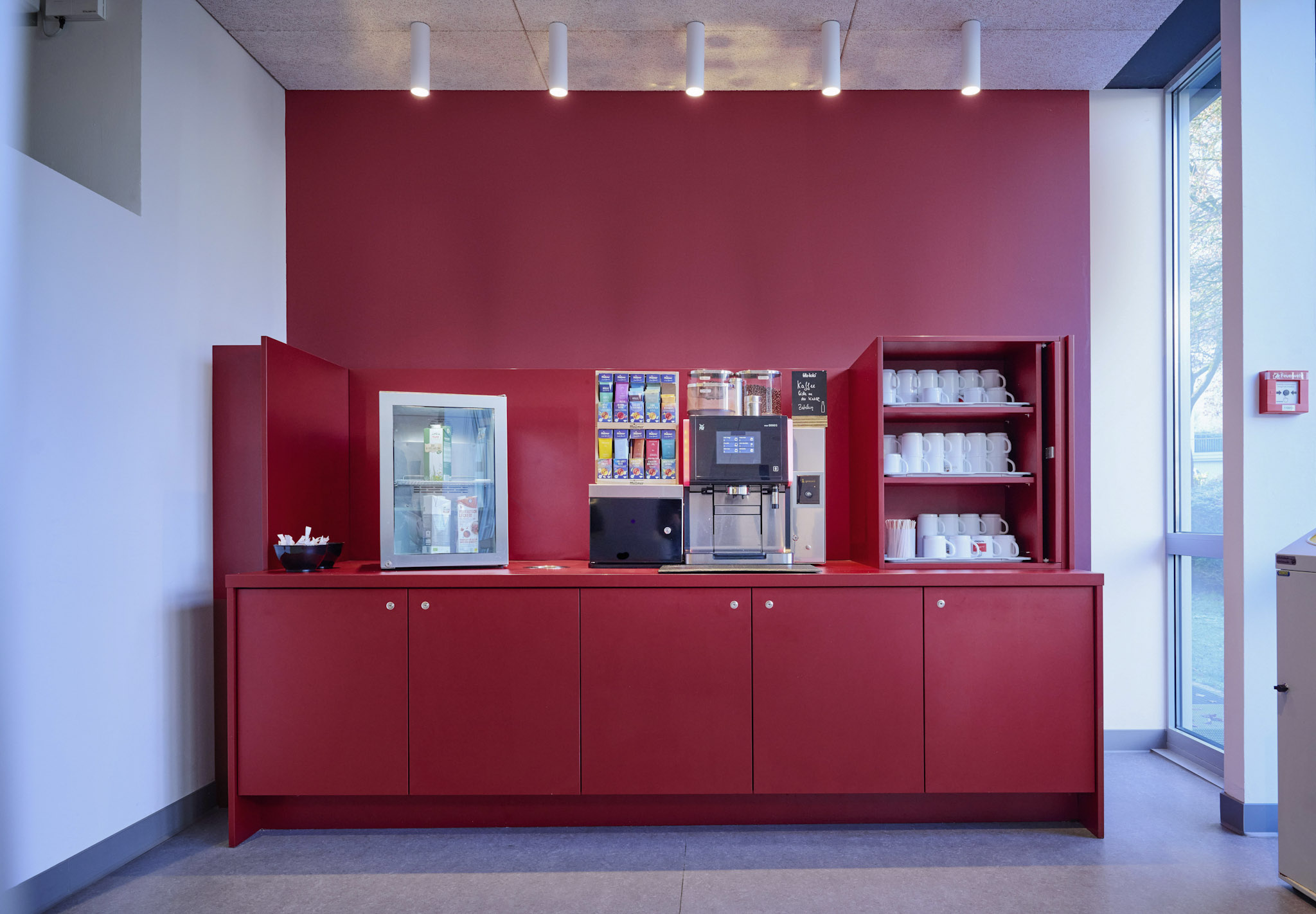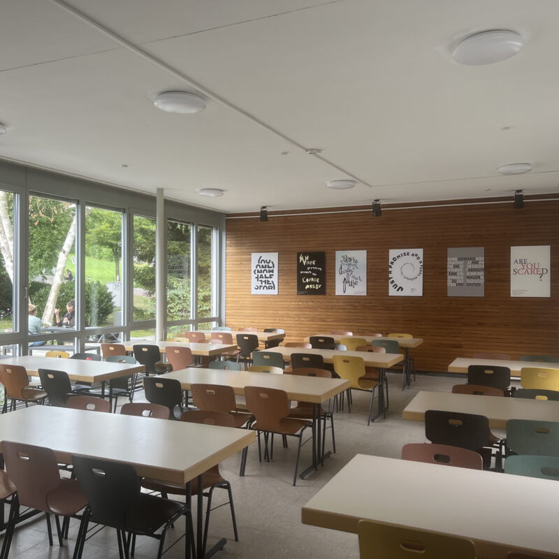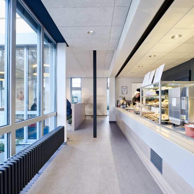 Die Sanierung der Mensa in der Hochschule sollte die Möglichkeit der durchgehenden Nutzung ermöglichen, also auch außerhalb der Öffnungszeiten als Aufenthaltsraum dienen. Die Raumgröße der ehemaligen Mensa wurde nicht verändert. Die vorhanden Tresenelemente wurden tischlermäßig umbaut, mit neuen Ausgabeplatten versehen und können nun durch motorische Rolladenanlagen verschlossen werden. Die Versorgung mit Getränken und Kaffee erfolgt unabhängig von den Öffnungszeiten über Automaten, welche in einer Wandnische, in der Nähe der Ausgabe platziert wurde. Zur Verbesserung der Raumakustik wurde eine HERADESIGN Decke eingebaut, im Bereich der Küche und im Nebenbereich Mineralfaserdecken. Unterschiedliche Sitzgruppen, an Einzeltischen, Bänken und Hockern sorgen für eine aufgelockerte Atmosphäre. Besonders die drei großen Leuchtschirme sorgen in Kombination mit den Einbauleuchten für ein harmonisches Gesamtbild. Durch den Einsatz von hellem Naturholz, weißen Flächen und den roten Sitzpoolstern und Einbauten wurde eine ruhige und freundliche Aufenthaltsqualität geschaffen.