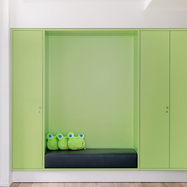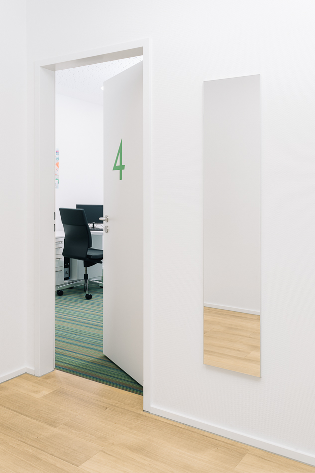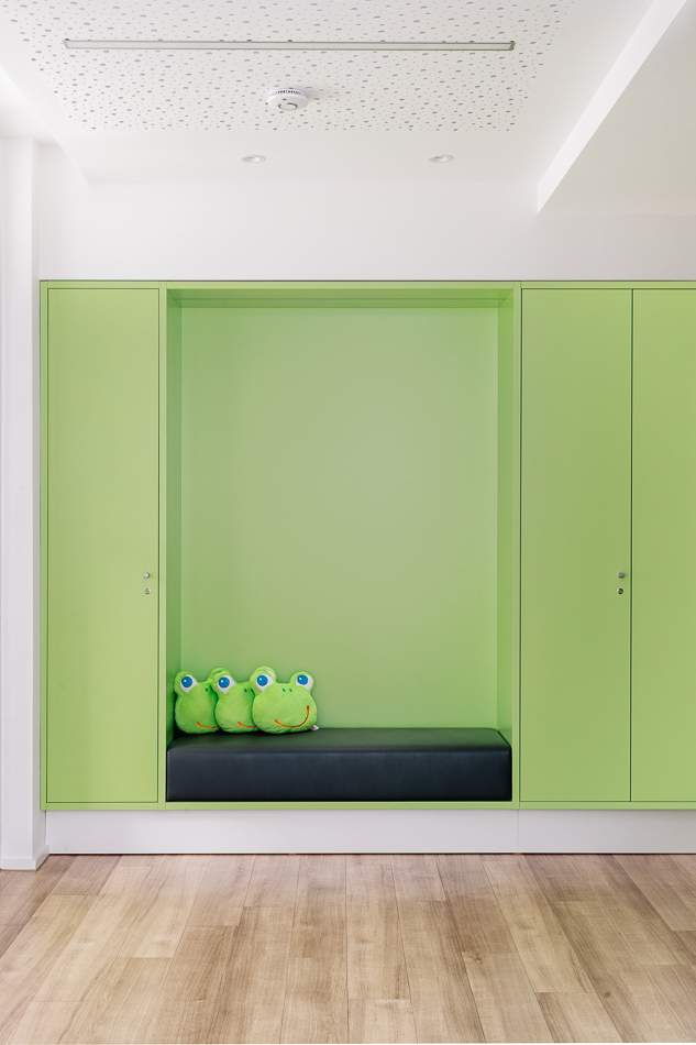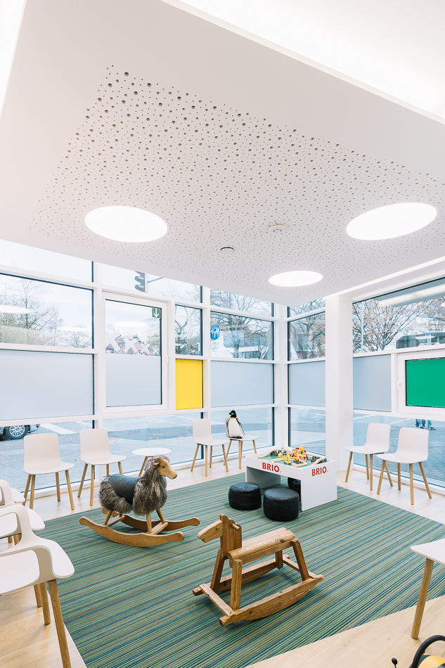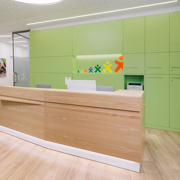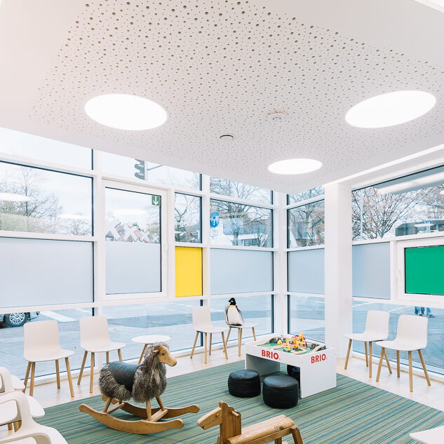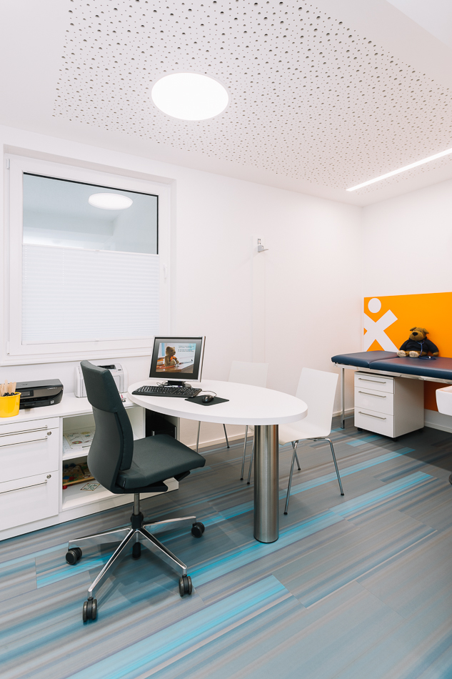 Im Neubau eines Wohn- und Geschäftshauses in Gütersloh wurde im Erdgeschoss eine Praxis für Kinder- und Jugendmedizin ausgebaut. Die Lage direkt an der Straßenkreuzung und der Zuschnitt der Grundflächen waren für die Umsetzung des Raumkonzeptes eine besondere Herausforderung. Große Glasflächen öffnen die Praxis zur Straße und bieten Einblick. Im Inneren sorgen Glaswände für die Belichtung des Empfangs und der inneren Flurbereiche. Wir haben bei der Planung und Umsetzung die Anzahl der Behandlungsräume mit den Nutzern abgestimmt sowie Funktionalität und interne Abläufe berücksichtigt. Durch den Einsatz von Naturholz in Kombination mit der Auswahl der Logo-Farben bei der Gestaltung sowie des Materials und der anspruchsvollen Beleuchtung entstand ein heller, freundlicher Gesamteindruck. Ein barrierefreies WC, Wickelplatz, getrennte Wartebereiche für Kleinkinder und Jugendliche sowie viel Raum zum Spielen runden das Gesamtkonzept ab.