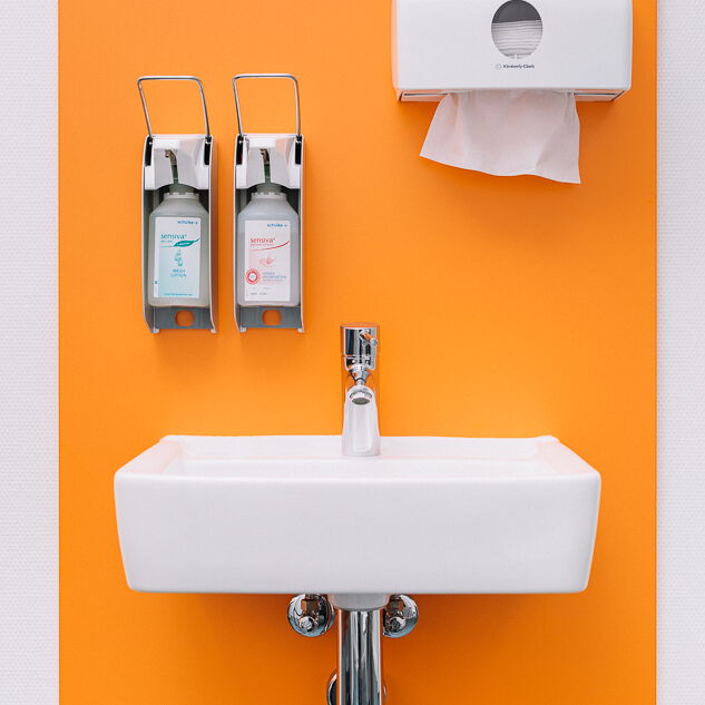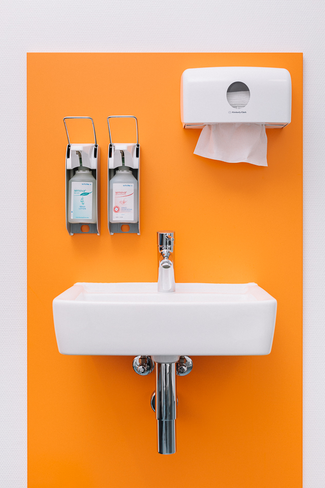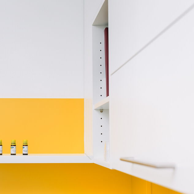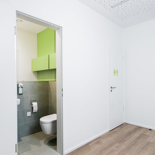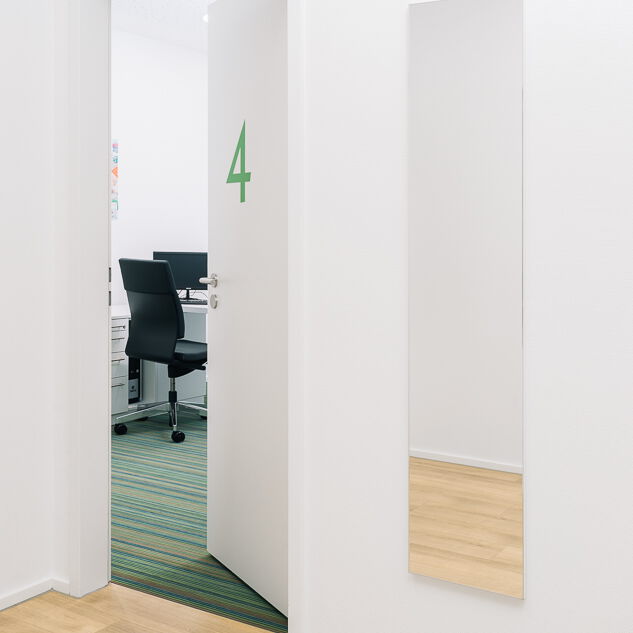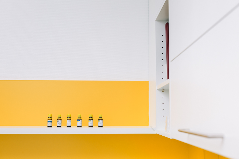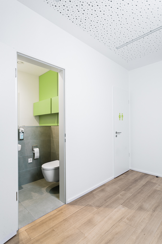 Im Neubau eines Wohn- und Geschäftshauses in Gütersloh wurde im Erdgeschoss eine Praxis für Kinder- und Jugendmedizin ausgebaut. Die Lage direkt an der Straßenkreuzung und der Zuschnitt der Grundflächen waren für die Umsetzung des Raumkonzeptes eine besondere Herausforderung. Große Glasflächen öffnen die Praxis zur Straße und bieten Einblick. Im Inneren sorgen Glaswände für die Belichtung des Empfangs und der inneren Flurbereiche. Wir haben bei der Planung und Umsetzung die Anzahl der Behandlungsräume mit den Nutzern abgestimmt sowie Funktionalität und interne Abläufe berücksichtigt. Durch den Einsatz von Naturholz in Kombination mit der Auswahl der Logo-Farben bei der Gestaltung sowie des Materials und der anspruchsvollen Beleuchtung entstand ein heller, freundlicher Gesamteindruck. Ein barrierefreies WC, Wickelplatz, getrennte Wartebereiche für Kleinkinder und Jugendliche sowie viel Raum zum Spielen runden das Gesamtkonzept ab.