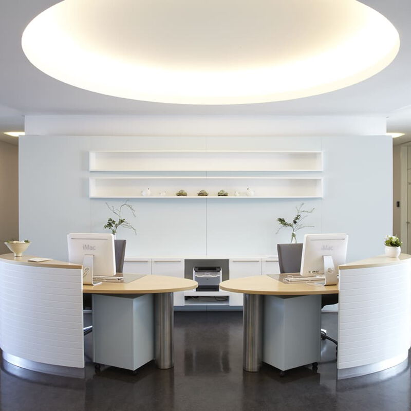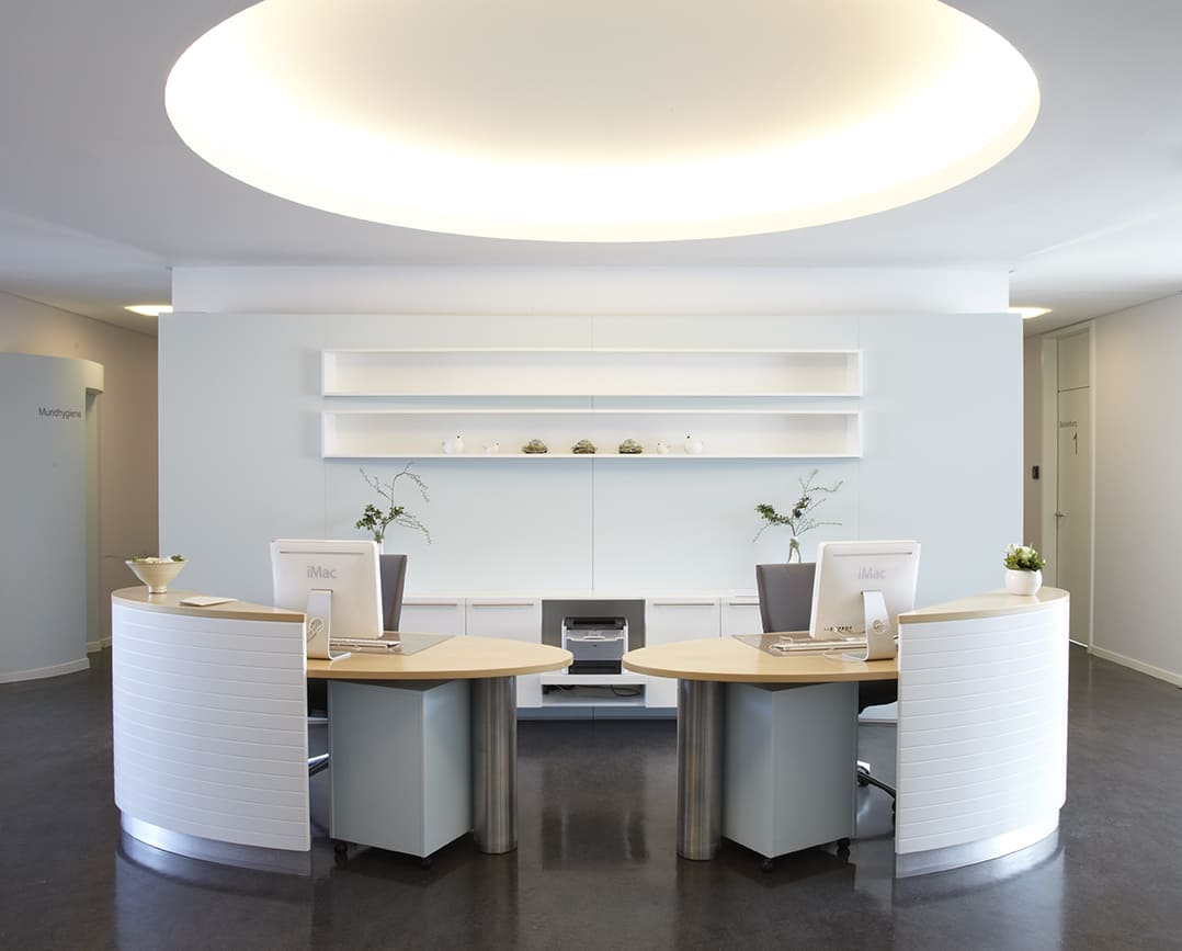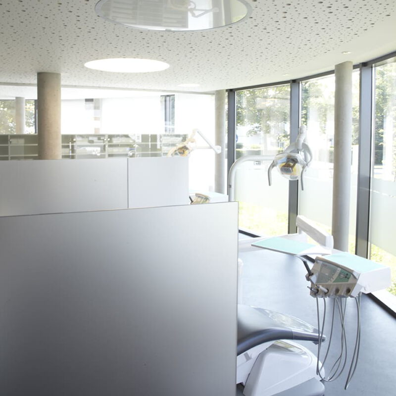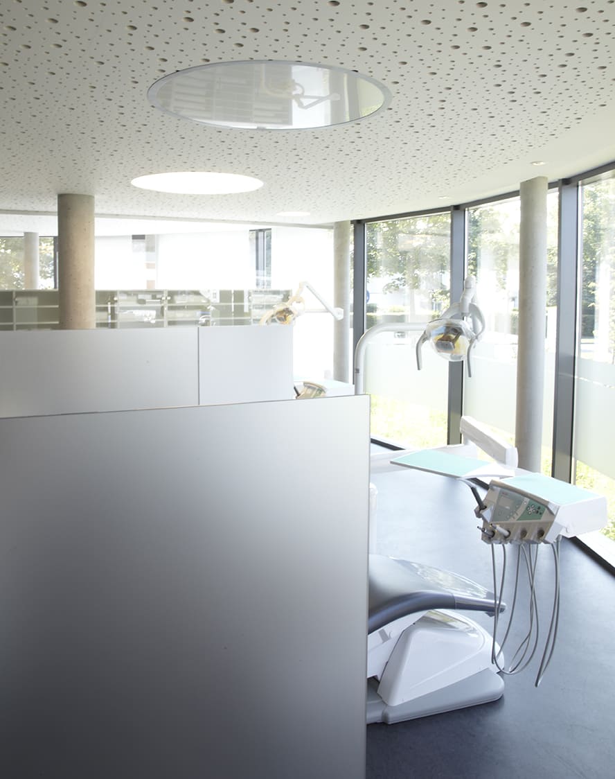 Für den Neubau eines zweigeschossigen Zentrums für Zahnmedizin in Paderborn übernahm unser Team die gesamte bauliche und innenarchitektonische Planung und deren Ausführung. Dabei wurde die Erschließung eines möglichen späteren Erweiterungsbaus bereits bei der Planung berücksichtigt, den wir fünf Jahre nach Eröffnung des Ärztehauses umsetzten. Das moderne Gebäude besitzt ein offenes Treppenhaus, das durch zeitlose Sichtbetonflächen und einem frei stehenden Aufzugschacht besticht und von beiden anliegenden Straßen betreten werden kann. Zudem spiegelt sich die außergewöhnliche Farb- und Materialgestaltung der Außenfassade mit unterschiedlichen Schwerpunkten in den Praxis- und Nutzflächen wider. Auch bei der innenarchitektonischen Gestaltung und der Auswahl funktionaler und ansprechender Möbel wurde Wert auf ein einheitliches Gesamtkonzept gelegt.