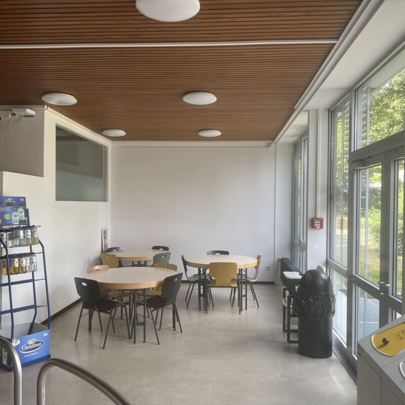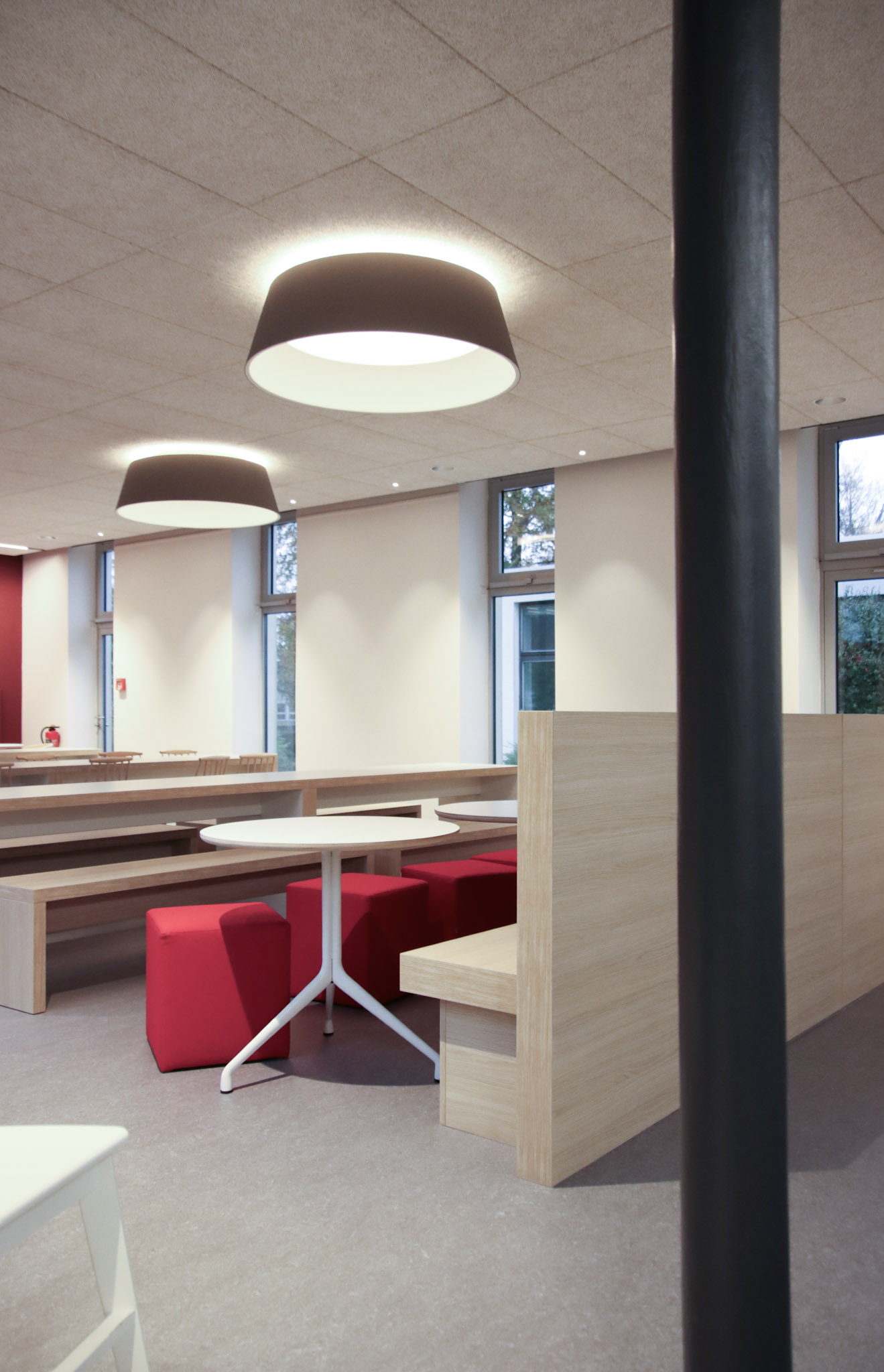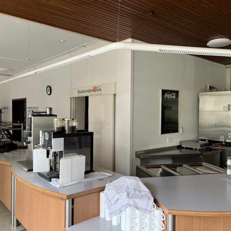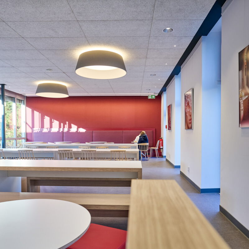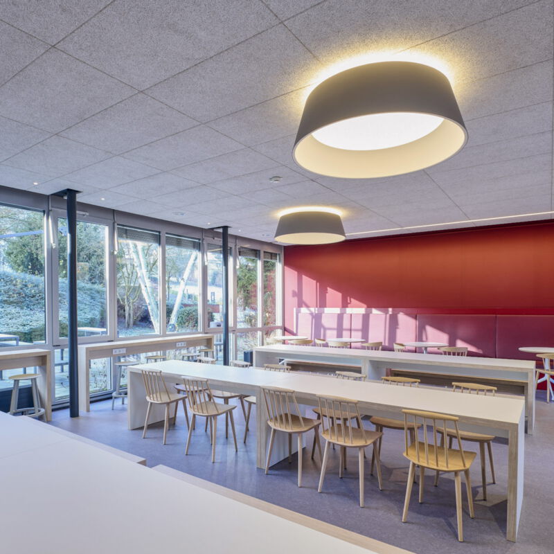 Die Sanierung der Mensa in der Hochschule sollte die Möglichkeit der durchgehenden Nutzung ermöglichen, also auch außerhalb der Öffnungszeiten als Aufenthaltsraum dienen. Die Raumgröße der ehemaligen Mensa wurde nicht verändert. Die vorhanden Tresenelemente wurden tischlermäßig umbaut, mit neuen Ausgabeplatten versehen und können nun durch motorische Rolladenanlagen verschlossen werden. Die Versorgung mit Getränken und Kaffee erfolgt unabhängig von den Öffnungszeiten über Automaten, welche in einer Wandnische, in der Nähe der Ausgabe platziert wurde. Zur Verbesserung der Raumakustik wurde eine HERADESIGN Decke eingebaut, im Bereich der Küche und im Nebenbereich Mineralfaserdecken. Unterschiedliche Sitzgruppen, an Einzeltischen, Bänken und Hockern sorgen für eine aufgelockerte Atmosphäre. Besonders die drei großen Leuchtschirme sorgen in Kombination mit den Einbauleuchten für ein harmonisches Gesamtbild. Durch den Einsatz von hellem Naturholz, weißen Flächen und den roten Sitzpoolstern und Einbauten wurde eine ruhige und freundliche Aufenthaltsqualität geschaffen.