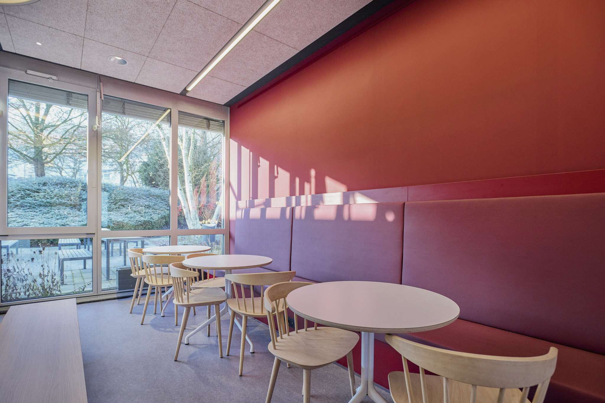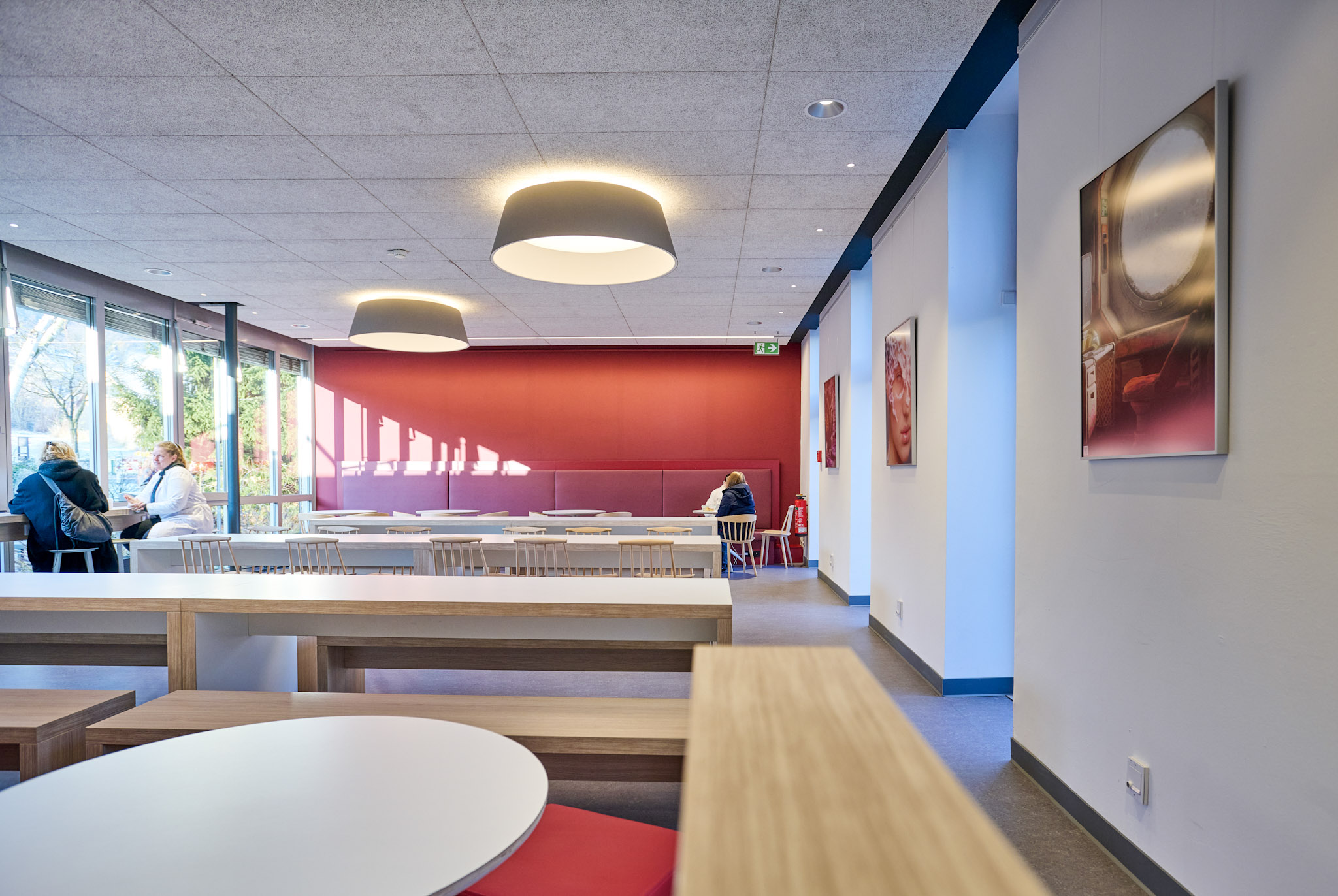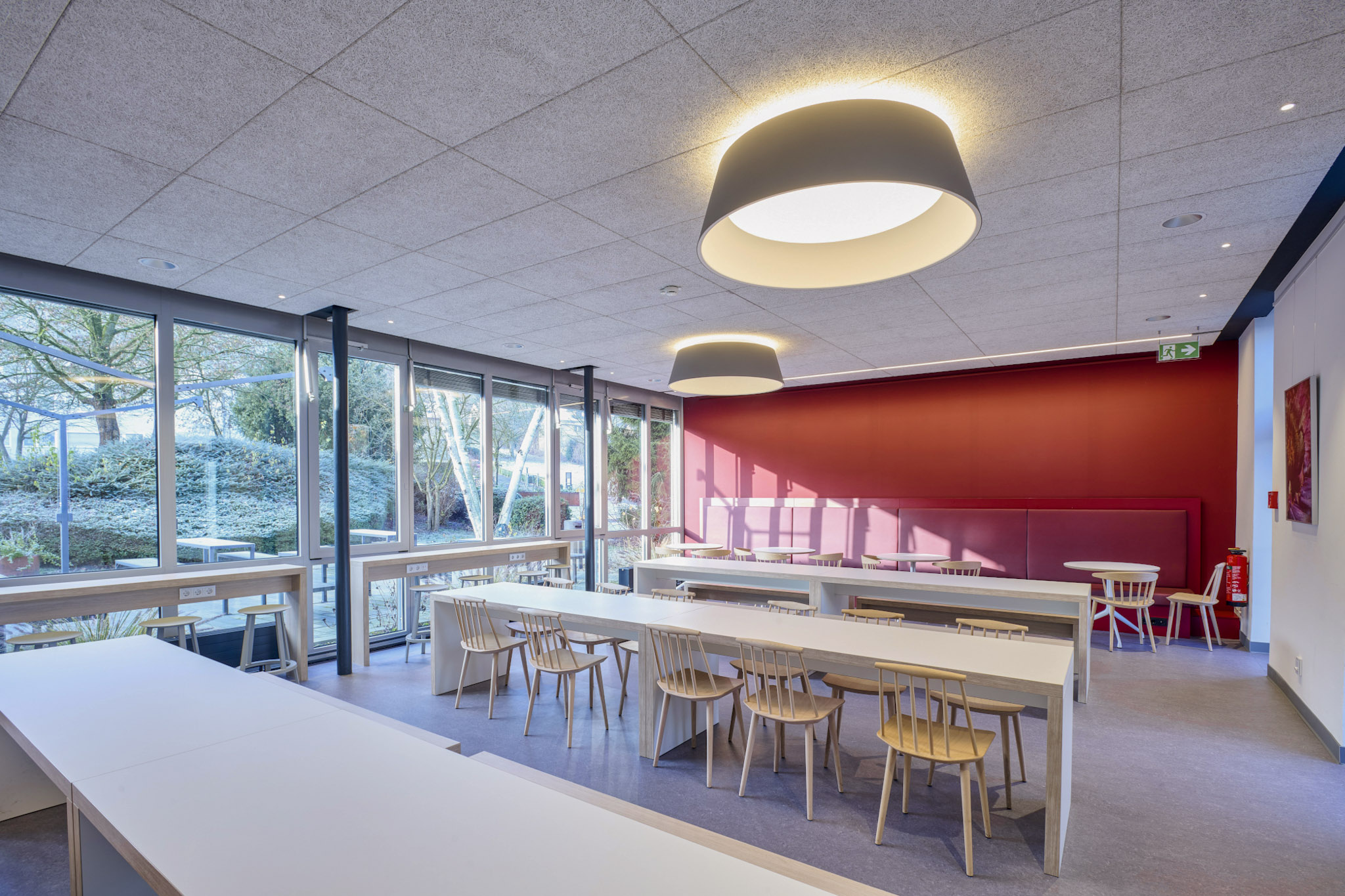 Die Sanierung der Mensa in der Hochschule sollte die Möglichkeit der durchgehenden Nutzung ermöglichen, also auch außerhalb der Öffnungszeiten als Aufenthaltsraum dienen. Die Raumgröße der ehemaligen Mensa wurde nicht verändert. Die vorhanden Tresenelemente wurden tischlermäßig umbaut, mit neuen Ausgabeplatten versehen und können nun durch motorische Rolladenanlagen verschlossen werden. Die Versorgung mit Getränken und Kaffee erfolgt unabhängig von den Öffnungszeiten über Automaten, welche in einer Wandnische, in der Nähe der Ausgabe platziert wurde. Zur Verbesserung der Raumakustik wurde eine HERADESIGN Decke eingebaut, im Bereich der Küche und im Nebenbereich Mineralfaserdecken. Unterschiedliche Sitzgruppen, an Einzeltischen, Bänken und Hockern sorgen für eine aufgelockerte Atmosphäre. Besonders die drei großen Leuchtschirme sorgen in Kombination mit den Einbauleuchten für ein harmonisches Gesamtbild. Durch den Einsatz von hellem Naturholz, weißen Flächen und den roten Sitzpoolstern und Einbauten wurde eine ruhige und freundliche Aufenthaltsqualität geschaffen.